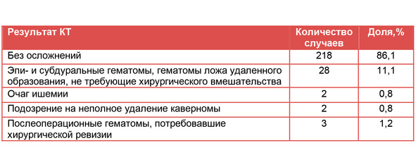 Для 5 больных потребовалось выполнение дополнительных хирургических операций. У двух больных проводилась ревизия послеоперационной раны для удаления гематомы (№2, 5). У больного №4 дважды выполнялось повторное иссечение частично удаленной каверномы, трижды проявлявшейся массивными кровоизлияниями. В одном случае выполнялась пластика костного дефекта (№5). У больной с множественными каверномами выполнялась пластика лицевого нерва (№10) (осложнение возникло после удаления каверномы ствола).