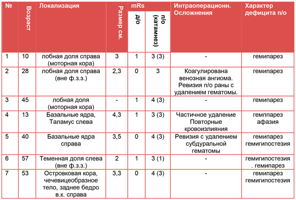 У трех пациентов выраженное неврологическое ухудшение возникло при благоприятной для операции локализации. В одном случае ухудшение было обусловлено послеоперационной гематомой в объеме до 40 см3, явившейся следствием венозного полнокровия из-за повреждения крупной венозной ангиомы (№2). Выполнена ревизия послеоперационной раны с удалением гематомы. У двух больных кавернома находилась вблизи моторной коры, однако проблемы с ее поиском привели к повреждению пирамидных путей, вследствие чего развился неврологический дефицит (№6, 12).