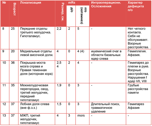 С учетом доброкачественной природы заболевания, выраженный послеоперационный неврологический дефицит следует рассматривать как тяжелое и нежелательное послеоперационное осложнение. К больным с выраженным послеоперационным неврологическим ухудшением относили пациентов, у которых после удаление каверномы зафиксировано увеличение оценки по шкале Rankin на 2 балла при оценке по Rankin не менее 3 баллов. Таких пациентов было 12 (таблица 40). Одна пациентка (№13) погибла вследствие возникновения в послеоперационном периоде тяжелого неврологического дефицита, в связи с чем также рассматривается в данном разделе.