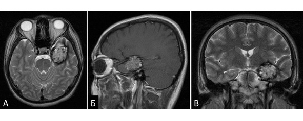 Рисунок 37. Клиническое наблюдение №7. Дооперационные томограммы больной Х. А – МРТ в Т2 режиме, аксиальная проекция, Б – МРТ в Т1 режиме, сагиттальная проекция, В – КТ, фронтальная проекция.