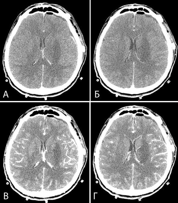 Рисунок 36. Клиническое наблюдение 6. Послеоперационное КТ больного, аксиальная проекция. Виден формирующийся крупный гиподенсивный очаг в области подкорковых структур слева. А, Б – без контрастного усиления. В, Г – с контрастным усилением.