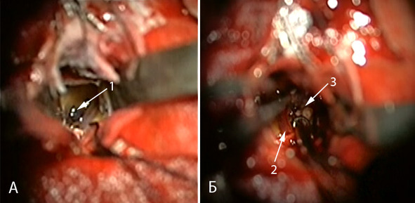 Рис 38. Клиническое наблюдение №7. Интраоперационные фотографии. Правый передний транскаллезный доступ. А – доступ на этапе после каллезотомии. 1 – кавернома в области отверстия монро. Б – Этап удаления каверномы. 2 – кавернома, 3 – отведенная левая передняя мозговая артерия.