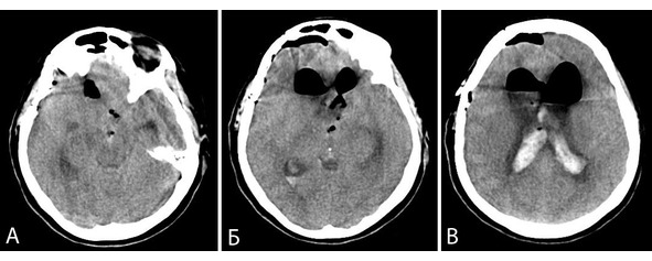 Следует упомянуть о ряде ранних послеоперационных осложнений, которые не будут отражены в других разделах. Послеоперационные менингиты, потребовавшие дополнительного курса антибиотикотерапии, зафиксированы в 3 случаях. В одном случае после лобно-височной трепанации отмечалась назальная ликворрея, купированная консервативно. У одного больного наблюдался послеоперационный пневмоторакс – осложнение после установки подключичного катетера, потребовавшее дренирования плевральной полости.