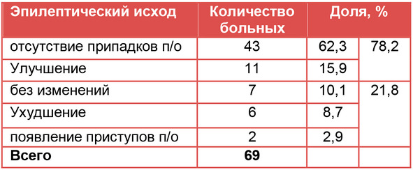 Одной из основных задач при удалении каверном полушарий большого мозга является избавление больного от эпилептических приступов. Эпилептический синдром у больных с супратенториальными каверномами может характеризоваться наличием редких и очень редких приступов, либо отсутствием каких-либо закономерностей в частоте припадков. Данный факт обосновывает необходимость достаточно длительного периода послеоперационного наблюдения для оценки эффективности лечения. Катамнестические данные оценивали у больных, оперированных в институте с 2002 по 2007 год (6 лет). Таким образом, минимальный срок катамнеза превышал 24 месяца. Из 154 человек, оперированных за указанный период, удалось собрать информацию о состоянии 84 пациентов (54,5%). Средняя продолжительность наблюдения составила 4,6 года.