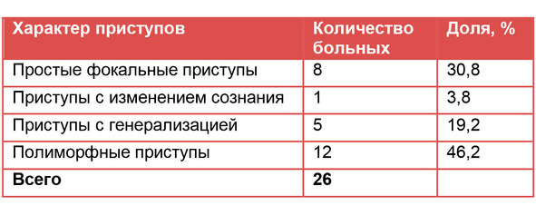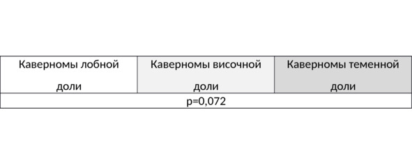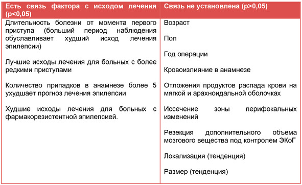 Достоверной связи между исходами лечения эпилепсии и такими факторами, как размер и локализация каверномы, не выявлено, однако, следует отметить наличие тенденций, которые на материале большего объема могут оказаться достоверными (слева направо ухудшение исхода):