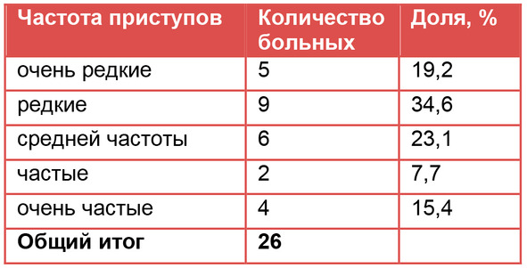 Таблица 44. Распределение больных по частоте приступов после операции.