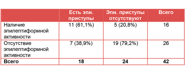 Таблица 46. Распределение больных в зависимости от наличия эпилептиформной активности и припадков после операции.