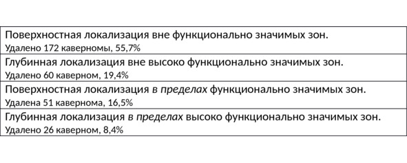Такие факторы, как наличие гематомы и плотность каверномы, имеют определенное влияние на технику удаления и исходы лечения. Согласно нашим данным, плотные и петрифицированные каверномы (встречались в 15,1% случаев) чаще выявляются в более позднем возрасте. Корковые плотные и петрифицированные каверномы обычно обнаруживаются у больных, страдающих тяжелыми формами эпилепсий. Их удаление путем фрагментации чаще сопровождается кровотечением. Наличие гематомы облегчает удаление образования за счет эффекта декомпрессии образования после дренирования лизированной крови.