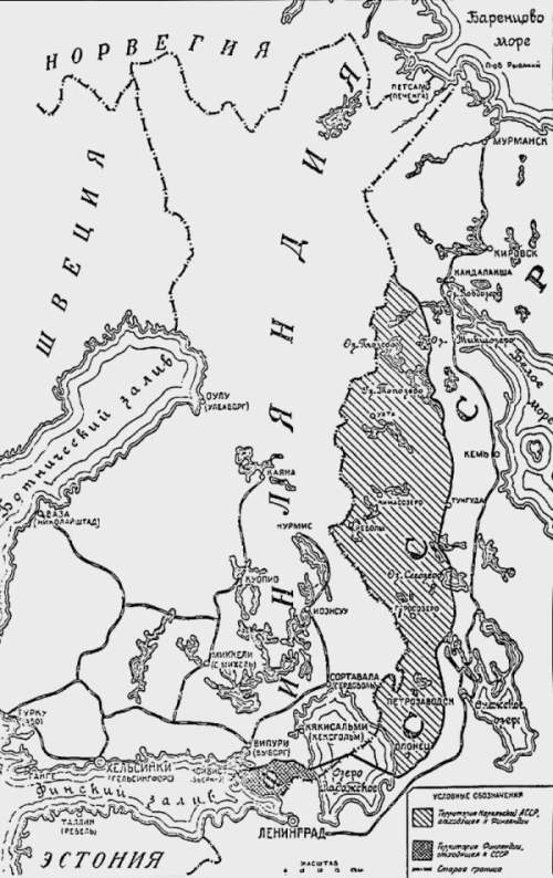 Карта с новой линией государственной границы между СССР и Финляндией – приложение к Договору о взаимопомощи и дружбе между Советским Союзом и Финляндской Демократической Республикой (созданным на время между Финляндией и СССР государством) от 2 декабря 1939 года