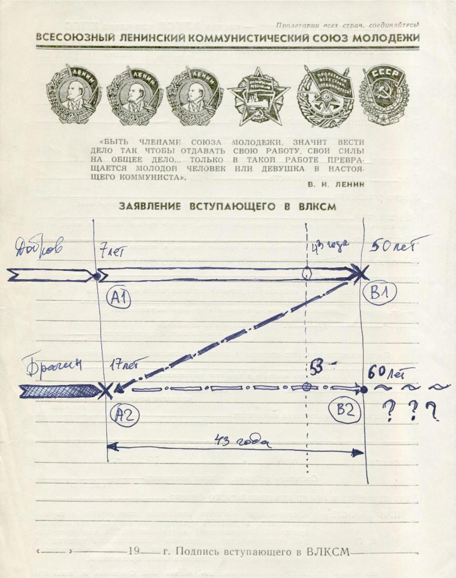 Я вытаскиваю из сумки папку с бумагами, жёлто-оранжевую ручку «Bic» с синим колпачком и лист бумаги. Ух-ты, заявление вступающего в ВЛКСМ. Ну, ладно, сгодится. Кладу лист на папку и начинаю набрасывать схему.
