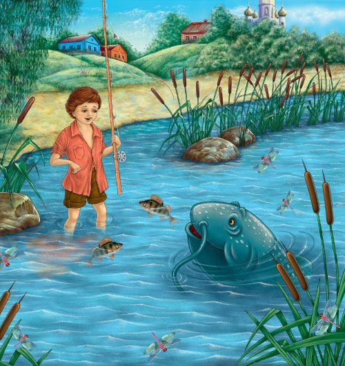 День уже клонился к полудню, а Ванечка так никого и не вытянул. Он стоял с удочкой по колено в воде и подумывал, а не пора ли домой, как вдруг сердце у него ушло в пятки: метрах в трёх от него из воды высунулась страшная усато-губастая морда. «Сом!» – догадался Ваня и похолодел от ужаса. Ему вспомнились страшные рассказы деревенских мальчишек о том, как старые сомы целиком заглатывали уток, собак и даже маленьких детей.