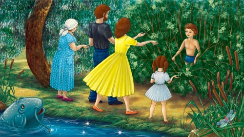 Отрыдавшись, вся семья пошла на берег озера. Не успели они позвать Деда Касьяна, как из воды показалась большая сомья голова.