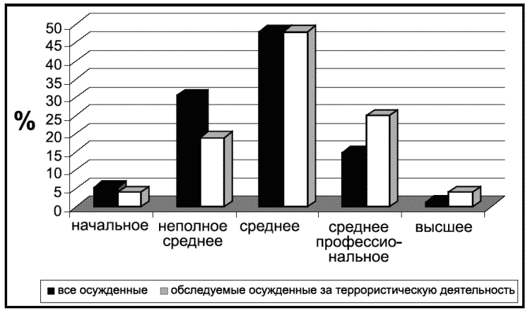 Сравнительный анализ уровня образования осужденных к лишению свободы с осужденными за террористическую деятельность показывает, что осужденные за ТД имеют более высокую образовательную подготовку. Поэтому выдвигаемые иногда предположения о вступлении в террористические организации по причине малограмотности представляются нам сомнительными.