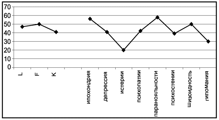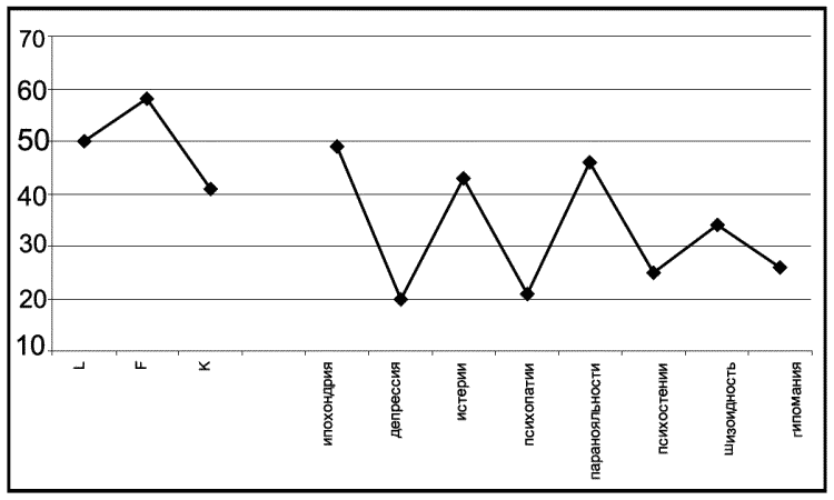 Профиль осужденного К. по опроснику «Диагностика личностных расстройств с помощью многофакторного опросника ММРI» («Мини-мульт»)