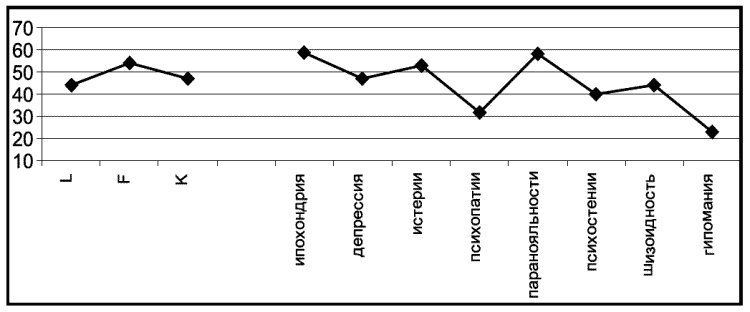 Профиль осужденного И. по опроснику «Диагностика личностных расстройств с помощью многофакторного опросника ММРI» («Мини-мульт»)