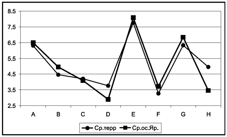 На этом фоне обратим внимание на наиболее существенные различия двух кластеров. С количественной точки зрения – это различия по показателям таких видов защит как регрессия и проекция. Причем по показателю регрессии графики даже расходятся в разные стороны. Учитывая тот факт, что проекция достаточно высока в обеих группах (кластерах), как это вообще свойственно всем осужденным, различия в показателях регрессии, видимо, указывают нам на специфику этой важнейшей формы психологических защит (проекции).
