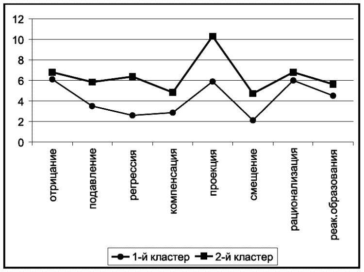 Примечательным является то, что для обследуемых отнесенных к 1-му кластеру характерны все виды психологических защит («отрицание», «подавление», «регрессия», «компенсация», «проекция», «смещение», «рационализация», «реактивные образования»). Для участников ТД, отнесенных ко 2-му кластеру, характерны только два вида психологических защит «отрицание» и «реактивные образования».
