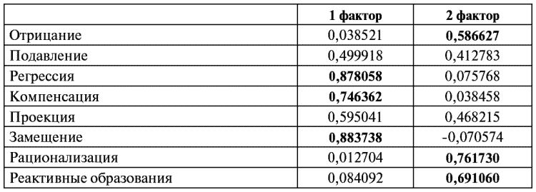Двухфакторная структура психологических защит у осужденных за ТД (жирным шрифтом выделены значимые нагрузки факторов)