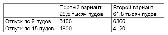 Крестьянское хозяйство, как было указано выше, могло отпускать от 9 до 15 пудов товарного зерна. Отсюда можно вычислить приблизительно, сколько хозяйств участвовало в снабжении этого похода. Данные по вариантам можно представить в таблице: