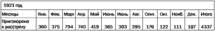 Я не располагаю обобщенными данными о количестве лиц, приговоренных военными трибуналами к смертной казни за всю Гражданскую войну. Но у меня есть документ о количестве расстрелов по приговору революционных военных трибуналов РСФСР и УССР в 1921 году, подписанный заместителем Председателя Военной коллегии ВерхТриба (так в тексте. – Д. В.) В. Сорокиным и заведующим учетно-статистической частью ВерхТриба М. Строговичем. (Кстати, надо иметь в виду, что 1921 г. был менее «урожайным» по количеству расстрелянных, чем 1918 и 1919 гг.) В справке, составленной в виде диаграммы, указано, что она подготовлена на основе телеграфных сообщений{489}489