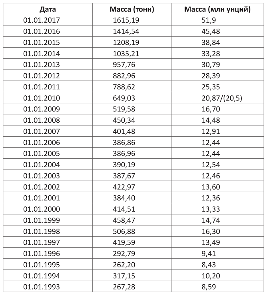 По состоянию на 1 ноября 2017 года золотой запас России составил 1801,2 тонны (согласно данным Всемирного золотого совета). Доля монетарного золота в общей стоимости золотовалютных резервов России составила около 17 процентов.