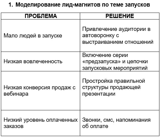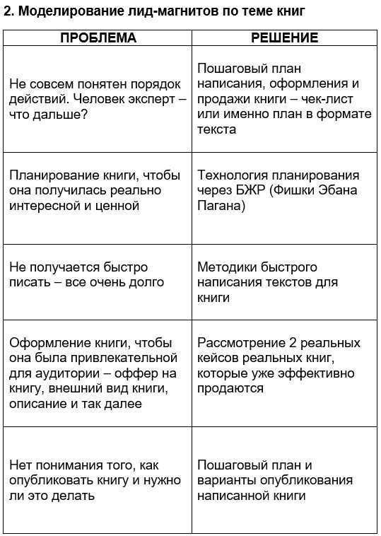 Первый пример – планирование лид-магнитов по теме запусков. Я заполняю табличку по проблемам и их решениям: