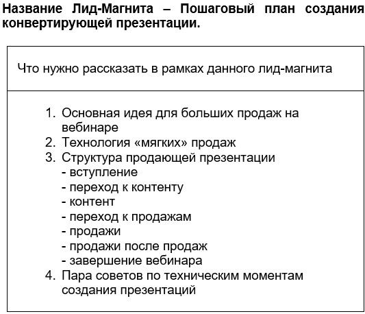Далее я выбираю один из лид-магнитов и отдельно планирую что в нем будет: