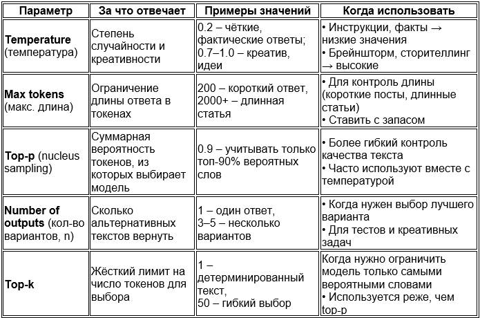 Вот 5 основных параметров запросов, которые часто используются при генерации текстов с помощью языковых моделей: