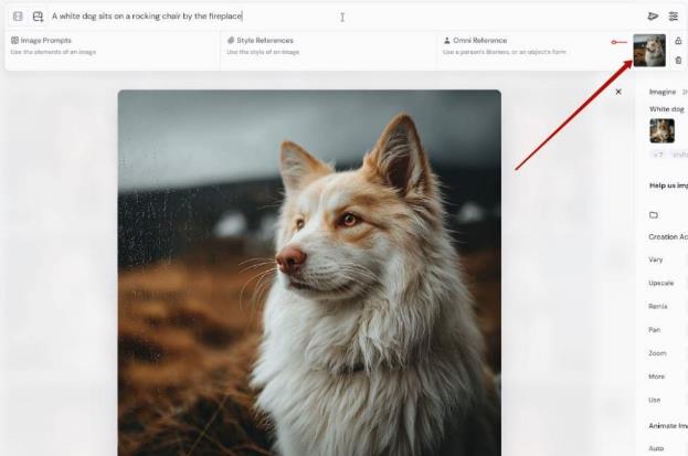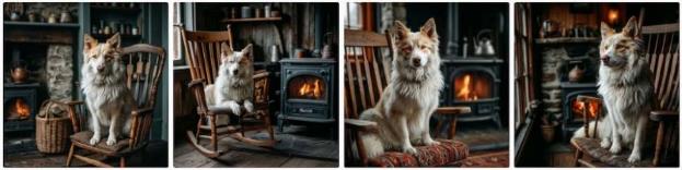 – Я взял в качестве персонажа изображение собаки и написал промпт Белая собака сидит в кресле-качалке у камина: