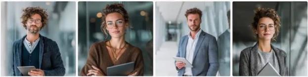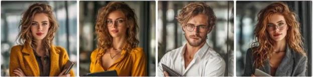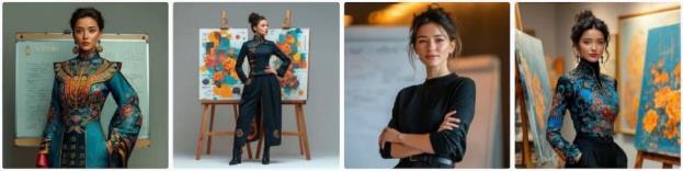 – Можно в промпте описать одежду, если вы хотите получить что-то определенное, например Молодая женщина в черном брючном костюме стоит у флипчарта: