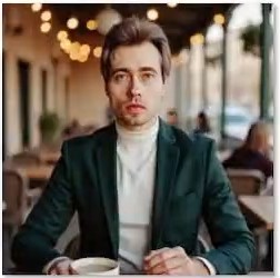 Фотография привлекательного молодого человека в зеленом костюме и белой водолазке, сидящего за столиком с чашкой кофе. Он смотрит прямо в камеру на фоне современного кафе, а люди за его спиной размыты. Освещение мягкое, у него коричневые волосы. Высокое разрешение. –ar 1:1