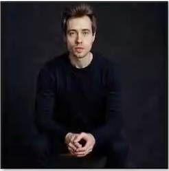A photo of an attractive young man in a green suit and a white turtleneck, working on a laptop.