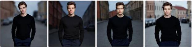 Промпт: красивый мужчина с каштановыми волосами, одетый в черную рубашку с длинными рукавами и темно-синие брюки стоит на оживленной улице
