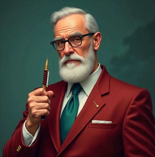 Сделай удивительное изображение про онлайн-маркетинг и копирайтинг, пусть на нем будет уютный кабинет со стильным опытным копирайтером с седой бородой, который работает за ноутбуком, рядом стоит микрофон, светящиеся элементы, эффекты, сине-красные цвета