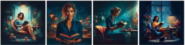 – Промпт: Красивая девушка с длинными волосами сидит в уютном кафе, читает книгу, тёплый дневной свет