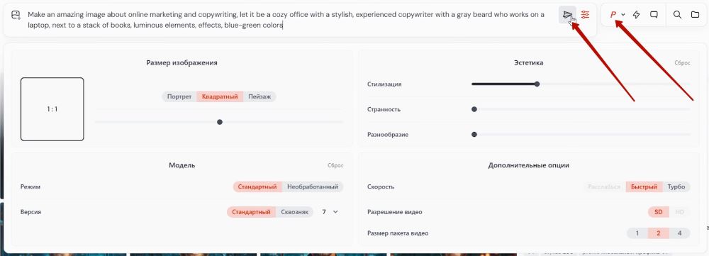 – Вставьте промпт в поле ввода запроса как обычно, при необходимости задайте другие настройки – соотношение сторон, модель нейросети и так далее