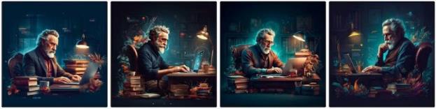 Сделай удивительное изображение про онлайн-маркетинг и копирайтинг, пусть на нем будет уютный кабинет со стильным опытным копирайтером с седой бородой, который работает за ноутбуком, рядом стопка книг, светящиеся элементы, эффекты, сине-зеленые цвета