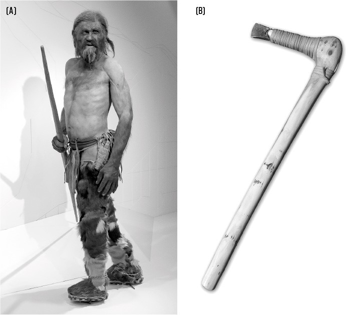 Рис. 2.1 (A) Ледяной человек Этци и (B) его топор с медным лезвием. Источник: Wikimedia Сommons