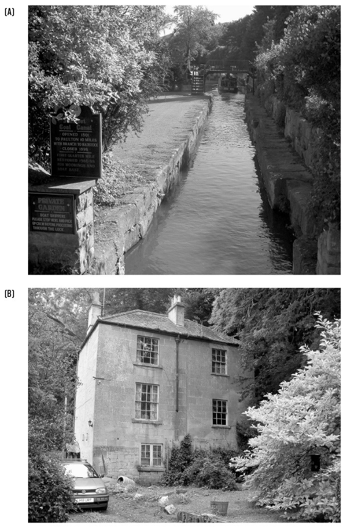 Рис. 7.2 (А) Нынешние остатки Сомерсетского угольного канала, землемерные съемки для которого в 1790-е гг. проводил Уильям Смит. Фото автора. (В) Дом Уильяма Смита в Такинг-Милл – деревне южнее Бата, где он жил во время работы на Сомерсетском угольном канале. Это единственный сохранившийся дом из тех, где жил Смит. Фото автора