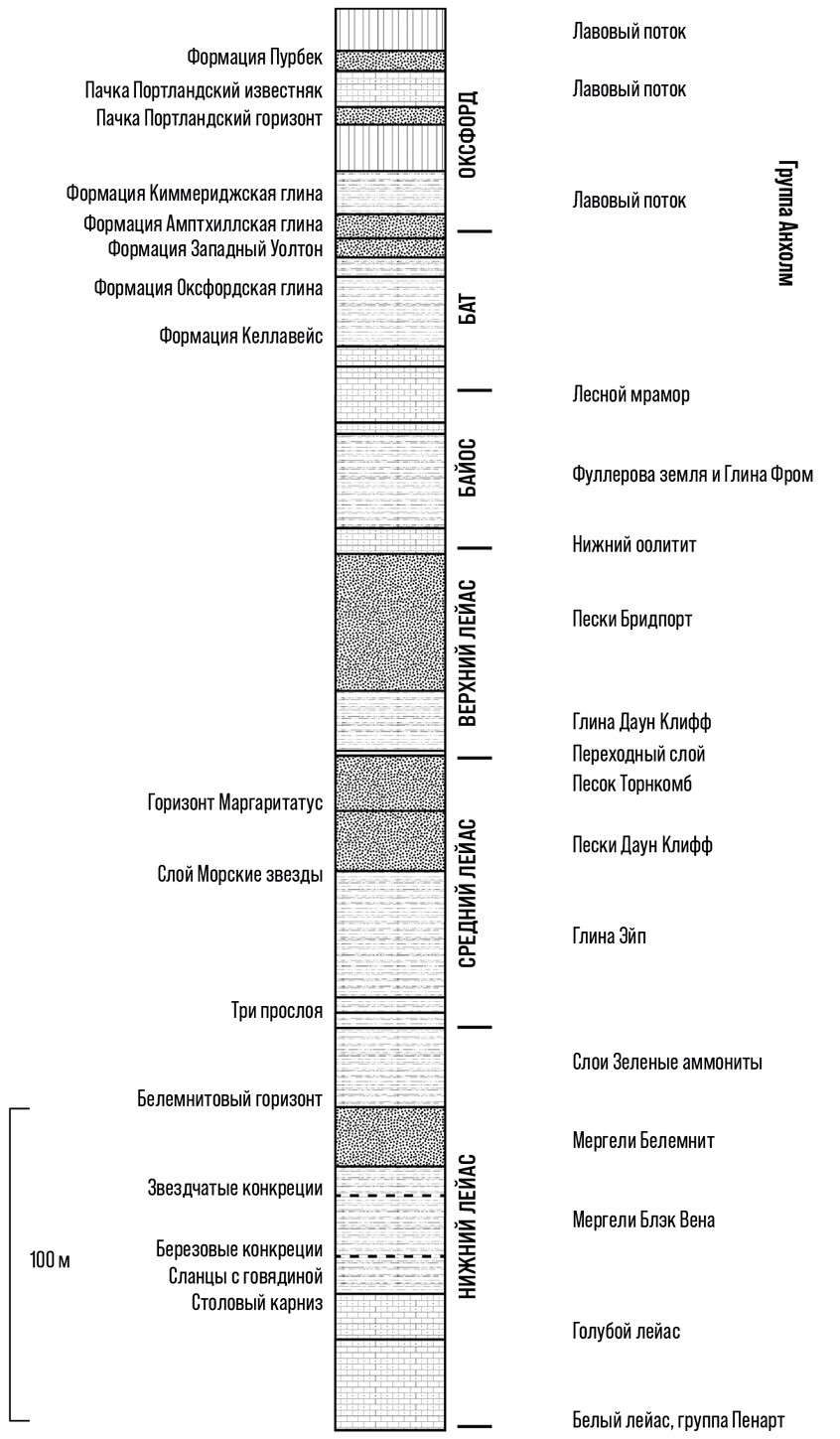 Рис. 7.3 Стратиграфический разрез юрских отложений в центральной Англии. Составлено по нескольким источникам