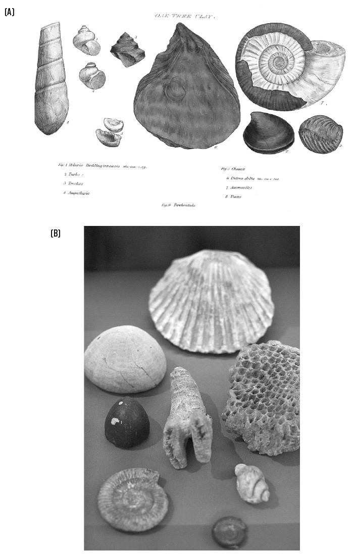 Рис. 7.4 Открытия Смита базировались на тщательном наблюдении и идентификации окаменелостей в каждом слое. (A) Иллюстрация из публикации Смита. (B) Фотографии некоторых окаменелостей Смита, которые сейчас хранятся в музейных коллекциях. Источник: Wikimedia Сommons