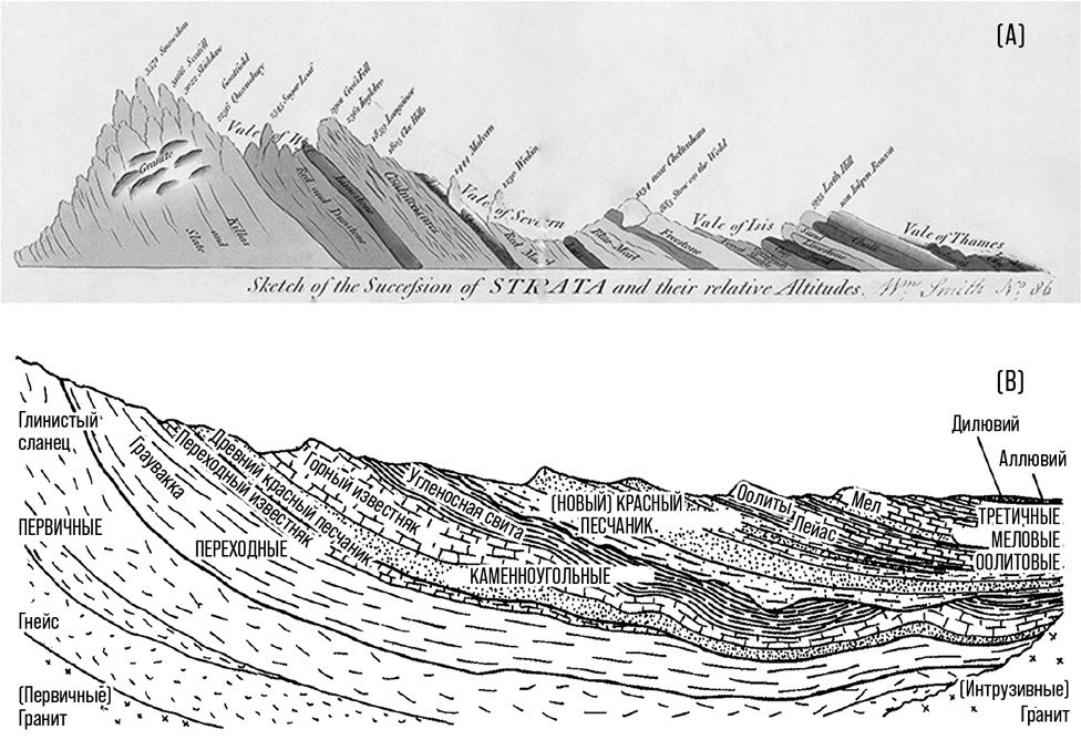 Рис. 7.6 (А) Составленная Смитом в 1815 г. схема геологического разреза от Уэльса до Лондона: от горы Сноудон и старейших пород в западном Уэльсе до молодых пород в районе Лондона. (В) Современный вариант того же геологического разреза с подразделениями, выделенными Смитом в 1815 г. Источник: Wikimedia Сommons