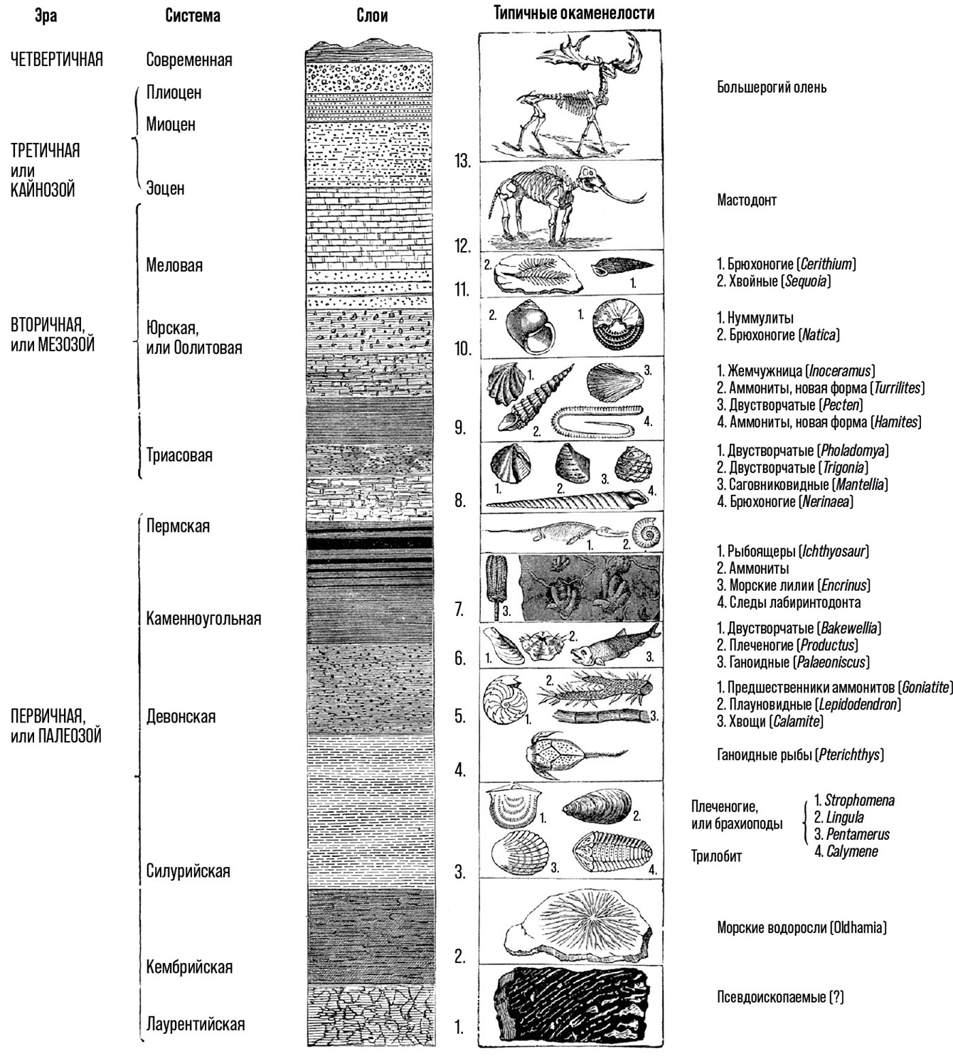 Рис. 7.7 Схема, показывающая известную последовательность окаменелостей по состоянию на 1840-е гг., построенную на принципе фаунистической преемственности (последовательности) Смита[28]28