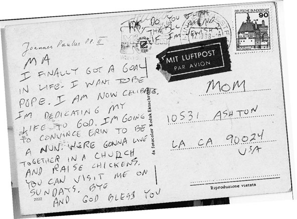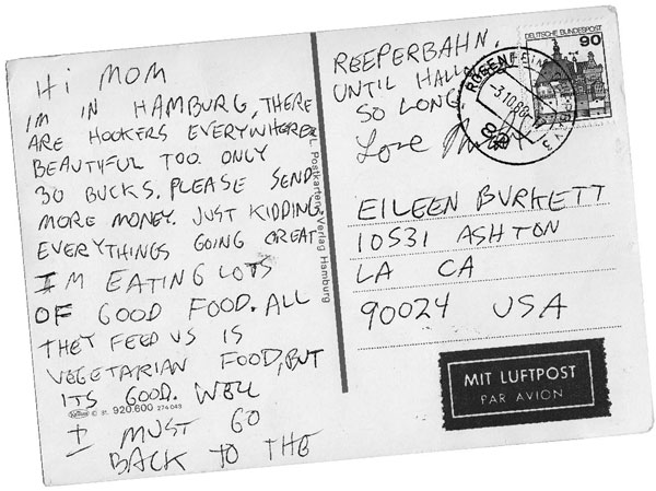 Привет, мама! Я в Гамбурге. Здесь повсюду проститутки. Они красивые. Всего 30 баксов. Вышли больше денег. Шучу, конечно. Все идет замечательно. Я ем много хорошей еды. Нас кормят только вегетарианской пищей, но она хорошая. Все, я должен вернуться в Репербан Холл. До встречи. Люблю.