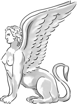 Отсылка к древнегреческому мифу о Сфинксе (крылатом чудовище с телом льва, лицом и грудью женщины), обитавшем на горе близ греческих Фив и убивавшем путников, которые не могли разгадать его загадку: «Кто из живых существ утром ходит на четырех ногах, днем на двух, а вечером на трех?» Разгадка, которой сумел доискаться фиванский царь Эдип, такова: это человек в разные возрасты своей жизни – ребенок, ползающий на четвереньках, полный сил зрелый человек и, наконец, старик с костылем. Раздосадованный тем, что его загадка разрешена, Сфинкс бросился вниз со скалы и погиб (по другой версии мифа, был убит Эдипом).