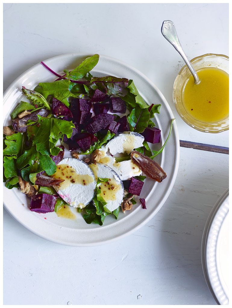 Салат с козьим сыром, свеклой, финиками и грецким орехом