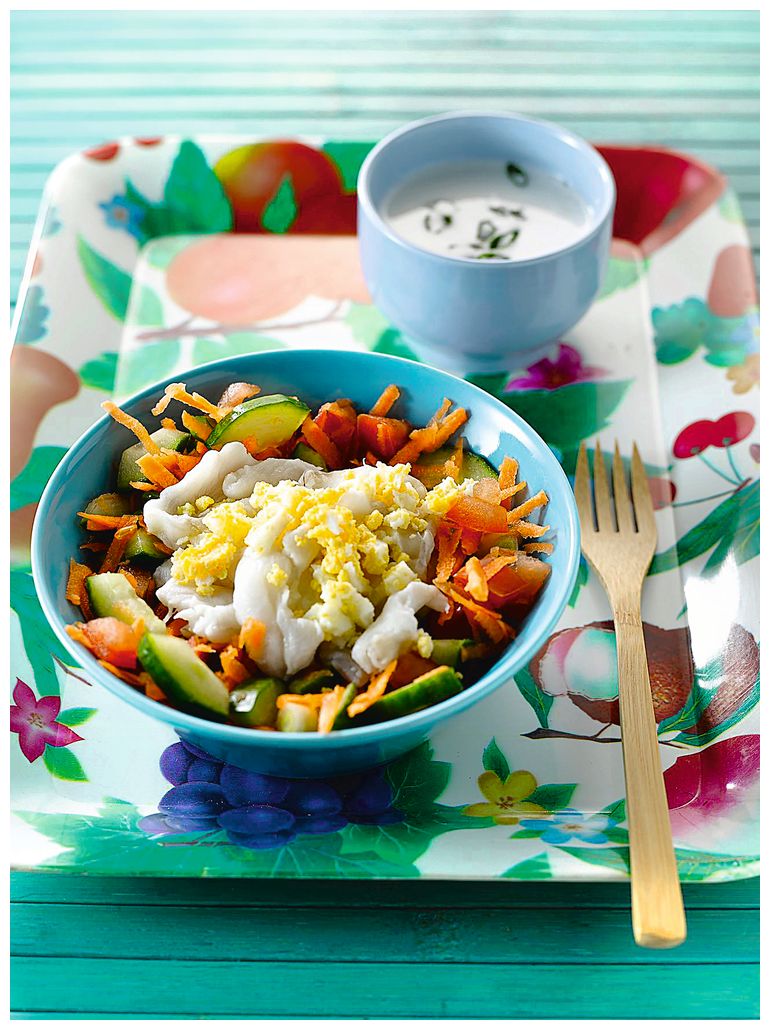 6. Смешайте все овощи и выложите на тарелку. Добавьте рыбу. Сверху полейте соусом. Яйцо разомните вилкой и посыпьте на салат.