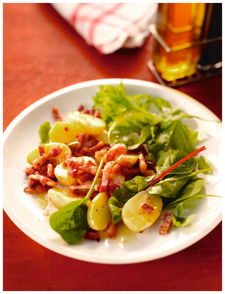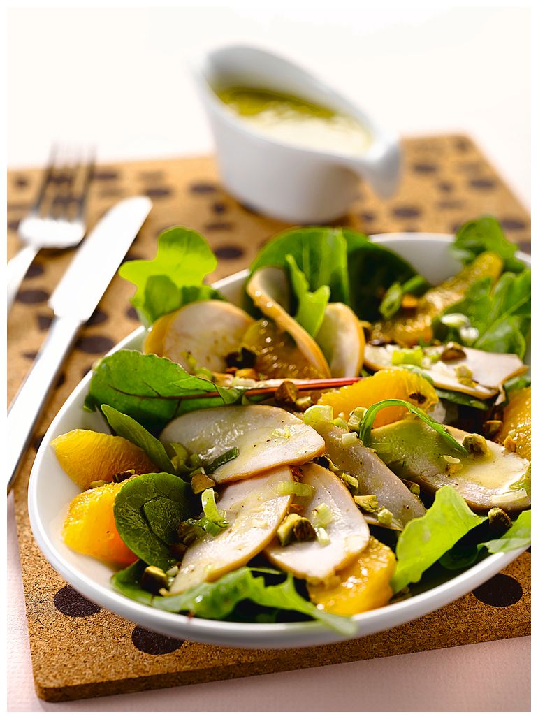 3. Выложите салат месклан на тарелку, добавьте остальные ингредиенты и полейте небольшим количеством соуса винегрет. Салат можно подавать к столу.