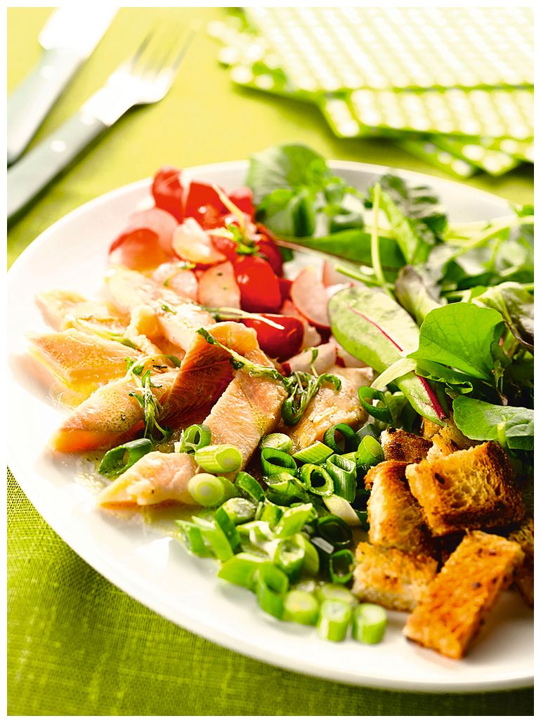 5. Добавьте запеченный багет с сыром к салату и подавайте к столу.