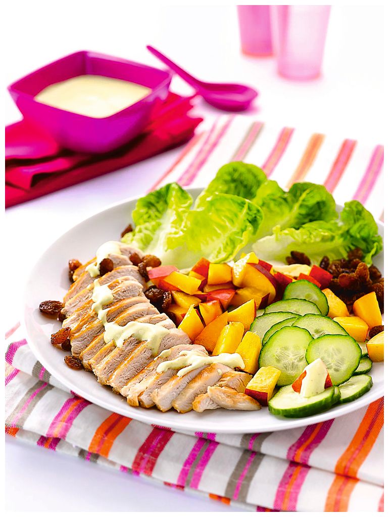 4. Выложите листья салата, кусочки нектарина и огурца на тарелку. Куриное филе нарежьте тонкими ломтиками и выложите на тарелку с салатом. Посыпьте изюмом и подавайте к столу с соусом.